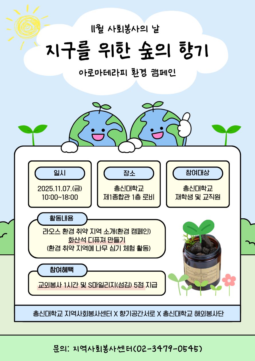 지역사회봉사센터와 '향기공간서로', '총신대학교 동계 해외봉사단'이 함께 '11월 사회봉사의 날' 행사를 진행하오니 많은 참여 바랍니다.