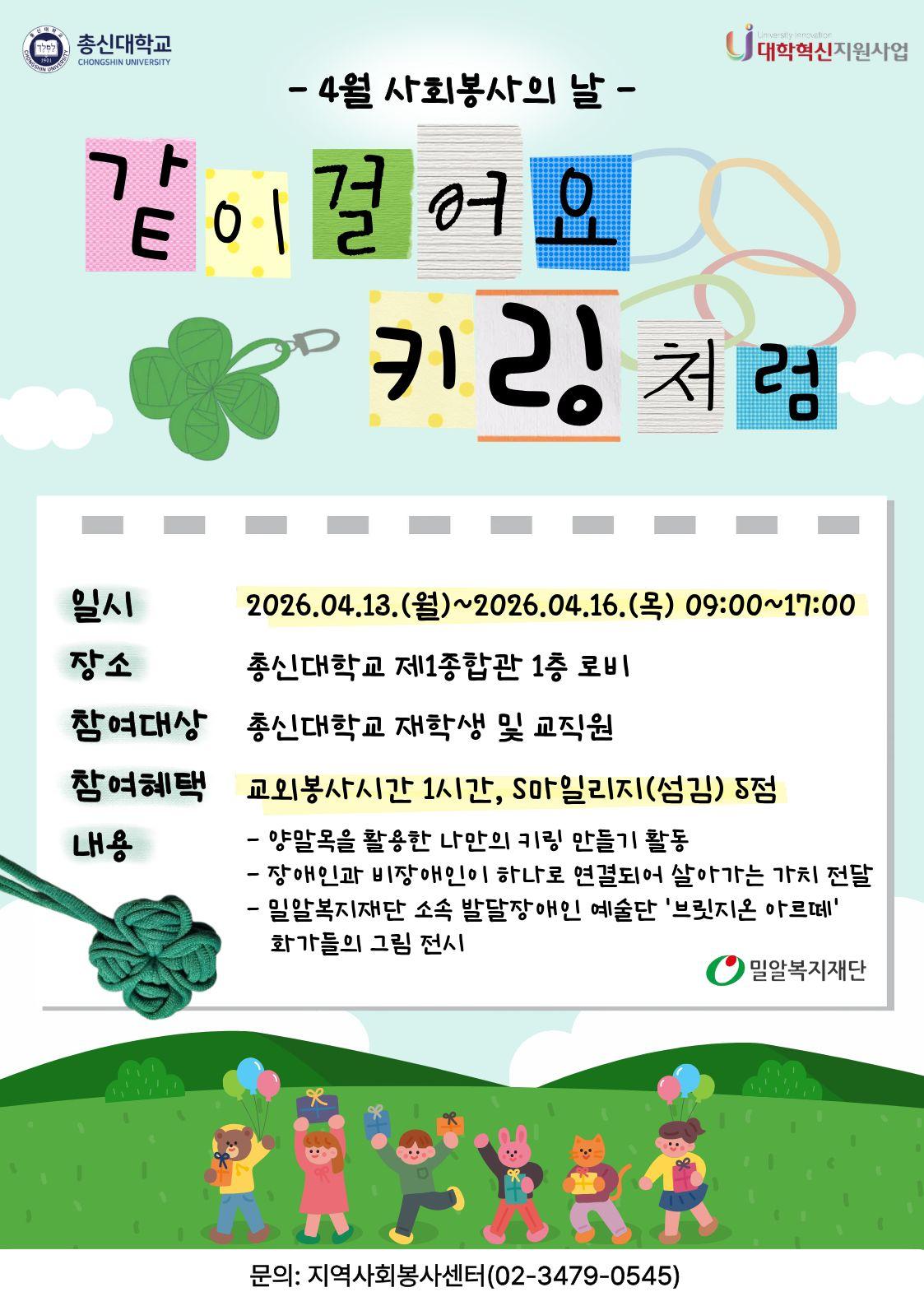 지역사회봉사센터에서는 '사회복지법인 밀알복지재단'과 협력하여 2026학년도 4월 사회봉사의 날을 아래와 같이 운영하고자 합니다.