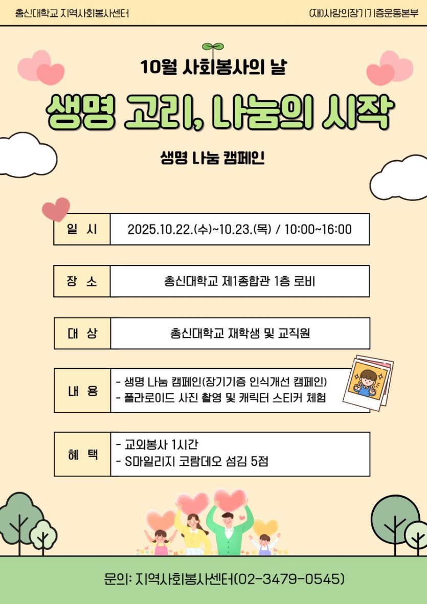 지역사회봉사센터와 협력기관인 (재)사랑의장기기증운동본부와 연계하여 '10월 사회봉사의 날' 행사를 진행하오니 많은 참여 바랍니다.