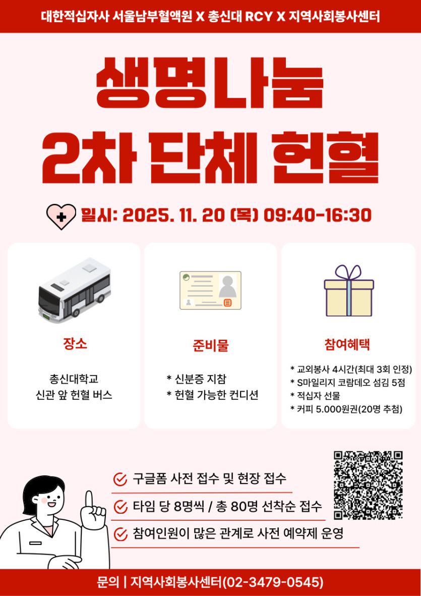 지역사회봉사센터에서는 대한적십자사 서울남부혈액원과 총신대 RCY와 협력하여 2025학년도 2학기 2차 단체헌혈을 실시하고자 합니다.